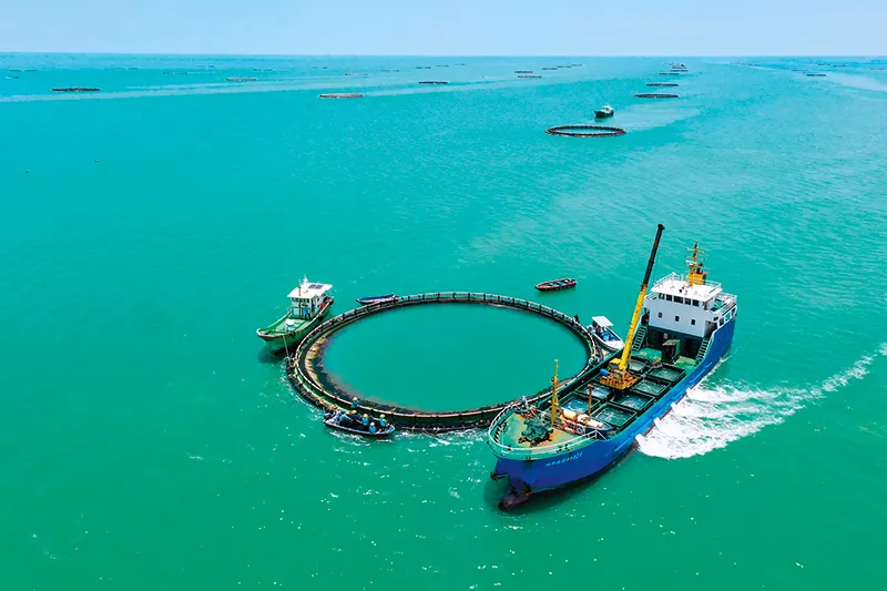 在广东省湛江市徐闻县西连镇,徐闻国桥深海养殖有限公司的金鲳鱼深海网箱整齐排列。(新华社/图)