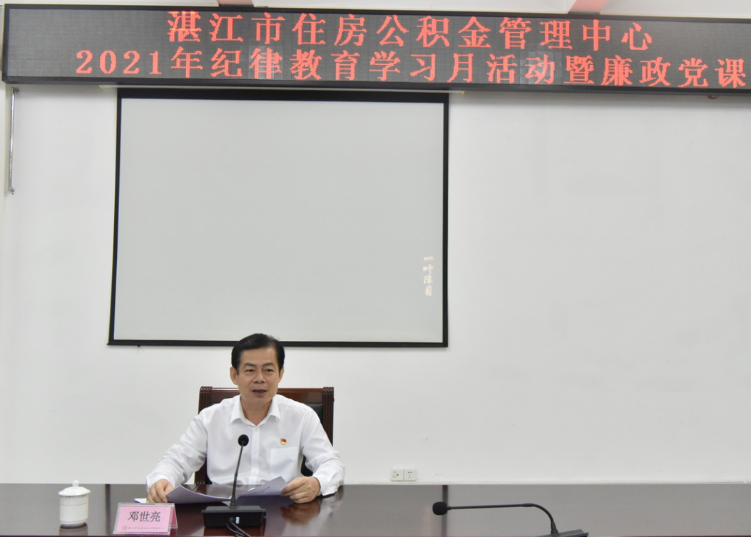 邓世亮同志强调,要继续按照纪律教育学习月活动的要求,落实好党课要求,进一步学习好贯彻好执行好党章党规党纪。一要落实市委和市纪委关于开展纪律教育学习月活动的相关部署要求,加强党章党规党纪和习近平总书记关于党风廉政建设的重要论述的深入学习,坚持读原著、学原文、悟原理,不断提升政治境界、思想境界、道德境界,增强“四个意识”、坚定“四个自信”、做到“两个维护”。二要深入推进市中心党风廉政教育,教育引导市中心全体党员、干部职工,特别是党员干部强化党章党规党纪意识,增强用党章党规党纪规范言行的思想自觉政治自觉行动自觉,严守政治纪律和政治规矩,自觉接受纪律约束,严以用权、依法办事,争做讲政治、守规矩、明是非的新时代住房公积金人。三要更加自觉地将纪律教育学习成果内化于心、外化于行,牢记住房公积金的初心使命,加强住房公积金行政执法专业化队伍建设,加大住房公积金行政执法力度,善于发挥制度震慑力,有力保障广大缴存职工的合法权益,为湛江住房公积金工作营造风清气正的服务环境作贡献。