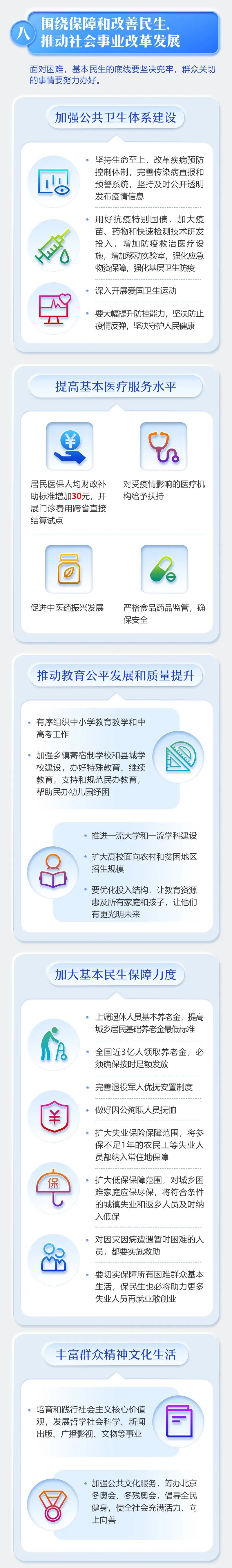 提高基本医疗服务水平。居民医保人均财政补助标准增加30元,开展门诊费用跨省直接结算试点。对受疫情影响的医疗机构给予扶持。促进中医药振兴发展。严格食品药品监管,确保安全。