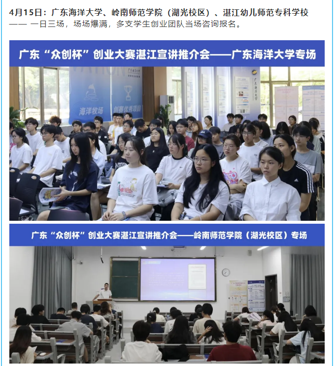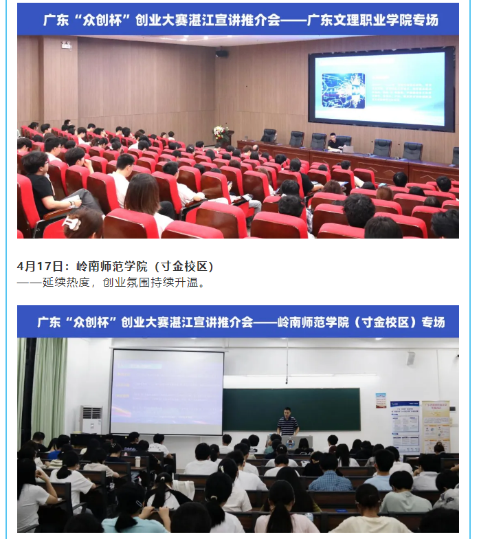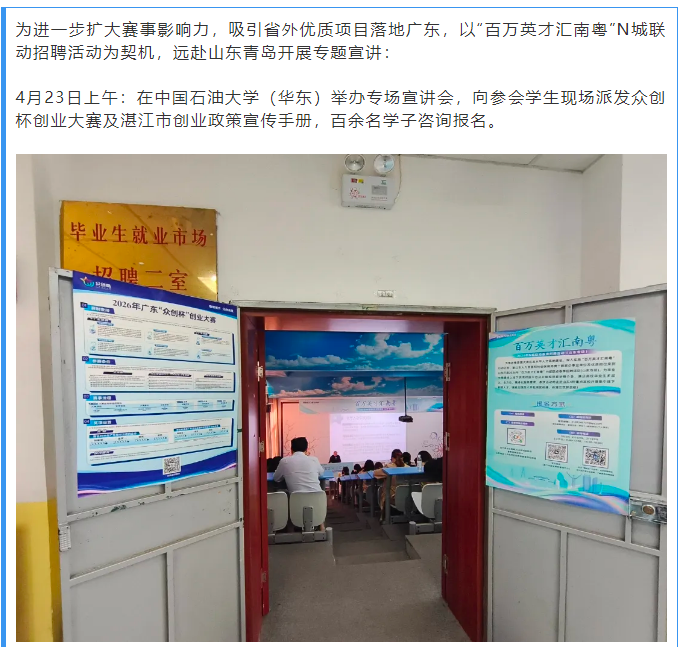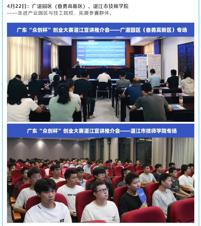 自3月起,湛江市人力资源和社会保障局组建“众创杯”创业大赛工作专班,结合省赛六大赛道参赛要求,紧扣湛江海洋经济、现代农业、民生服务、技能产业、人工智能应用等本土特色,深入各县(市、区)、高校、产业园区、孵化载体、行业协会、重点企业,开展密集宣讲。
