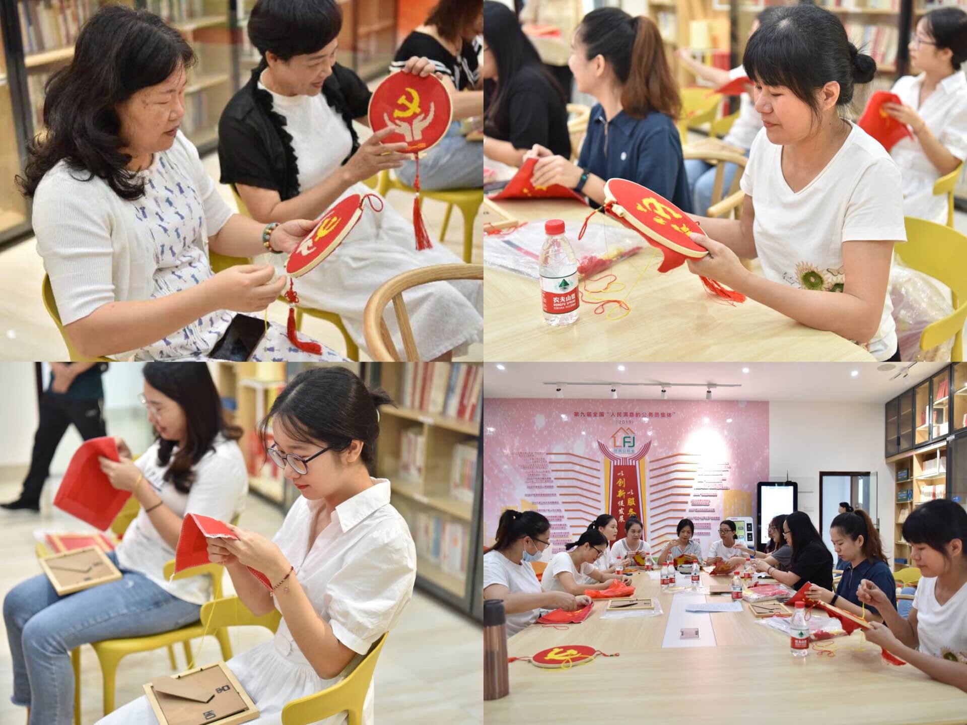 在桌球比赛、乒乓球比赛进入决赛的紧张时刻,市中心一批女同志们在阅览室进行十字绣创作,用一针一线绣出党徽、五星红旗等图案,绣出对党、对祖国的热爱和祝福。市中心领导班子成员来到图书阅览室,观看了女同志们的十字绣创作,并与她们合影。