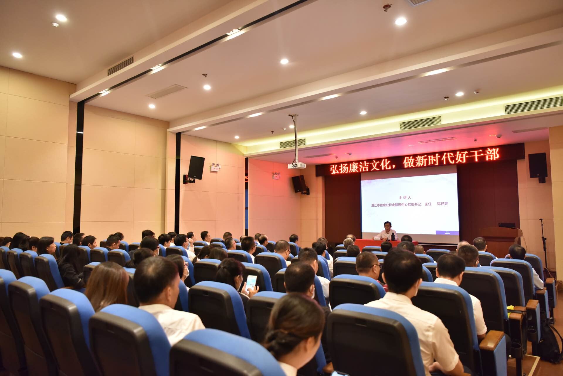 重温入党誓词后,党员们集中在纪念馆的影视厅,聆听湛江市住房公积金管理中心党组书记、主任讲党课。党课做到人人讲,让每个党员登台亮相讲党课,是湛江市住房公积金管理中心“六大特色党建”之一。邓世亮同志以“弘扬廉洁文化,做新时代好干部”为题目,从四个方面“一是重温2022年纪律教育学习月的主题和主要内容,二是优秀廉洁文化从古到今一脉相承,三是陈瑸公是我们学习的好榜样,四是弘扬廉洁文化做新时代的好干部”,跟党员们分享了一节精彩生动、针对性强、富有教育意义的党课。